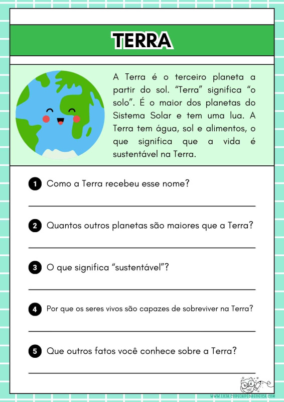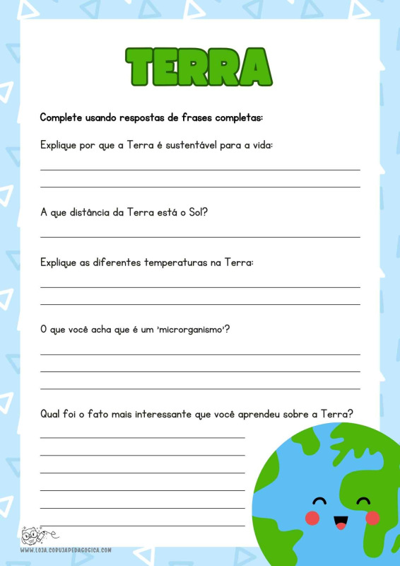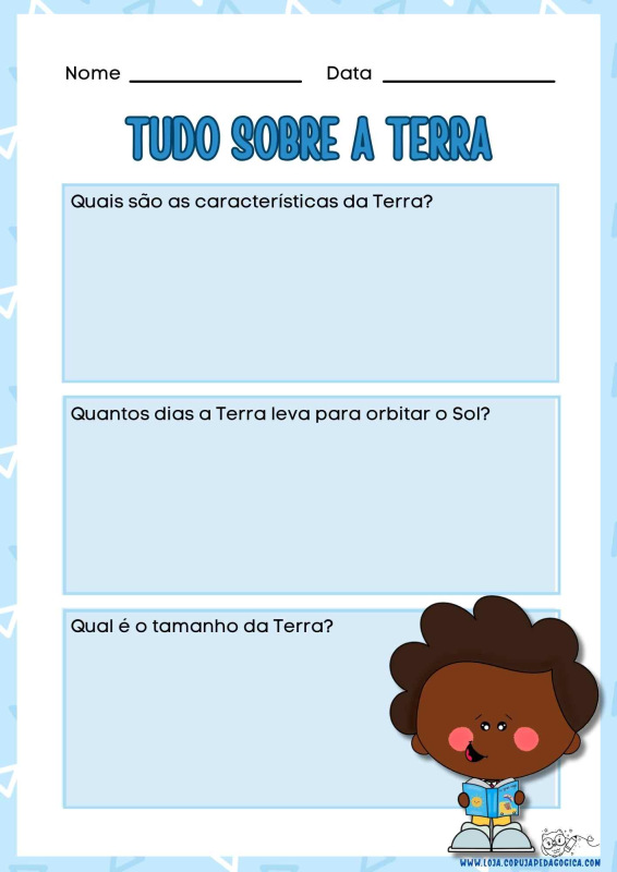 Este material traz +20 páginas com atividades sobre a Terra, suas camadas, atmosfera e importância para a vida.